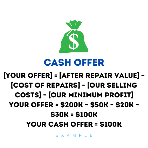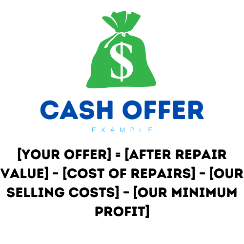 Our offers are determined by the value of your home post-repairs. This approach allows us to present you with the highest possible offer while ensuring we retain our profits, providing you with the cash you require. Below is a detailed explanation of how the offer is calculated.