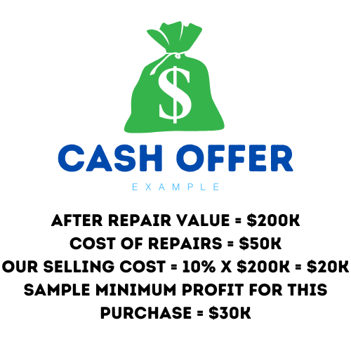 Cash buyers like us can offer you $80,000 for your home, which is $30,000 above its current value. This arrangement benefits us because, if your house is valued at $50,000 and we provide you with $80,000, then invest an additional $100,000 into it, the property's value can reach $200,000. This results in a total expenditure of $180,000, giving us a net profit of $20,000 (not accounting for other costs and taxes for simplicity's sake).